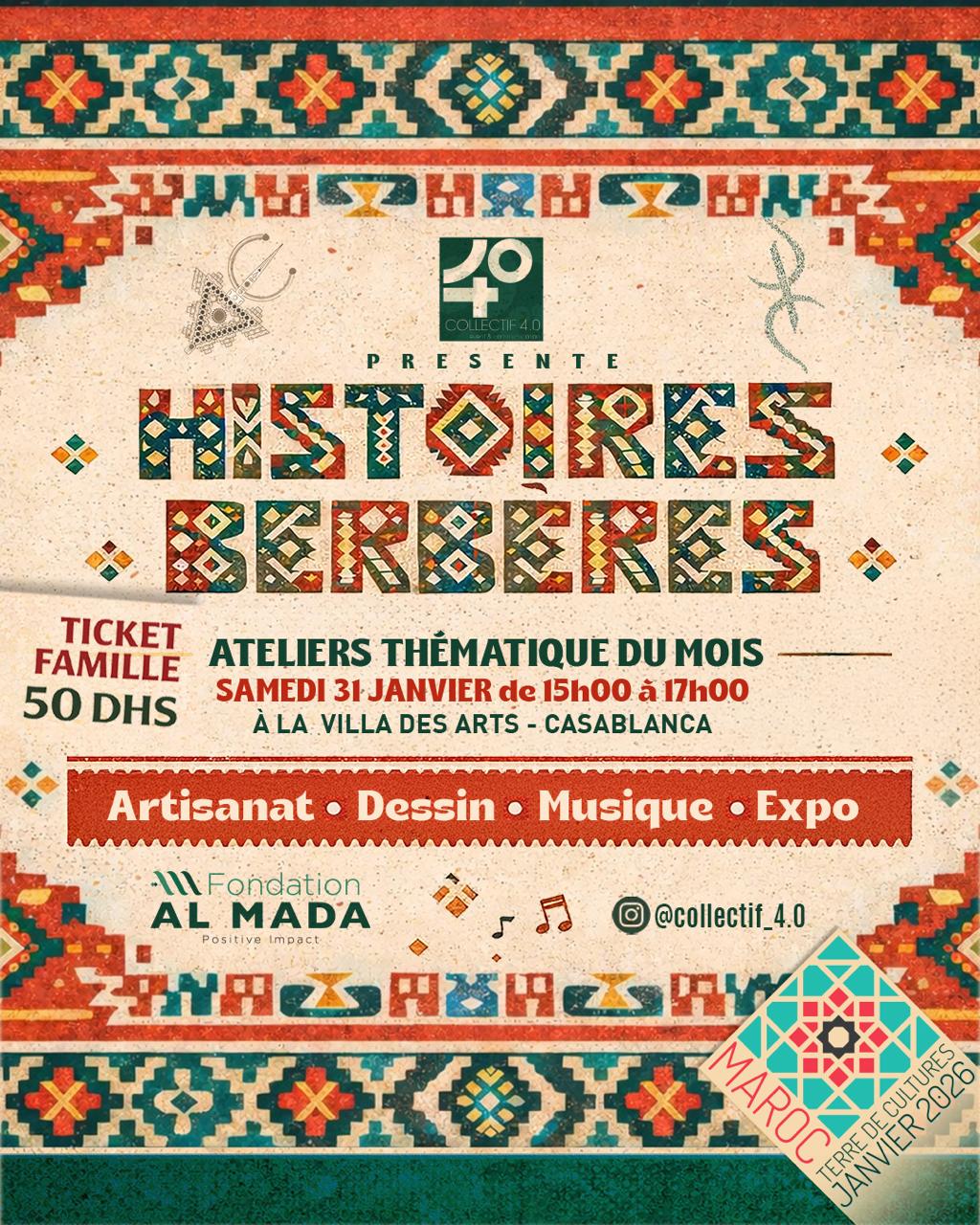 يدعو كولكتيف 4.0، بشراكة مع مؤسسة المدى، الجمهور لاكتشاف عالم «قصص أمازيغية»، وهي ورشة عمل موضوعاتية عائلية تحتفي بالثقافة الأمازيغية عبر الإبداع والخيال والتفاعل، وذلك يوم السبت 31 يناير 2026، من الساعة الثالثة إلى الخامسة مساءً، بـ دار الفنون في الدار البيضاء.